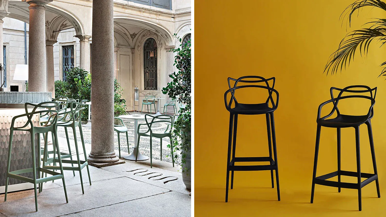 Dans la version tabouret de la chaise Masters, les pieds s’allongent, l’assise devient plus sobre, mais le signe graphique distinctif du dossier, créé par le croisement des lignes de trois assises emblématiques, demeure inchangé. Idéal à la maison comme dans les espaces collectifs, Masters Stool trouve aussi parfaitement sa place en extérieur.