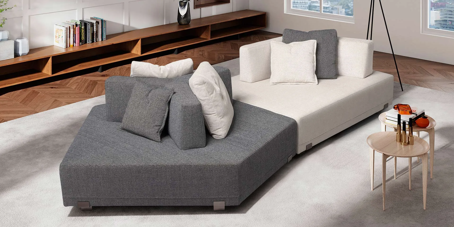Canapé modulable sans dossiers et accoudoirs fixes, conçu pour être utilisé de tous les côtés dans des ambiances modernes où il devient le protagoniste de l’espace salon. Les amples assises, combinables librement, sont suspendues sur des élégants pieds à la forme de Z.